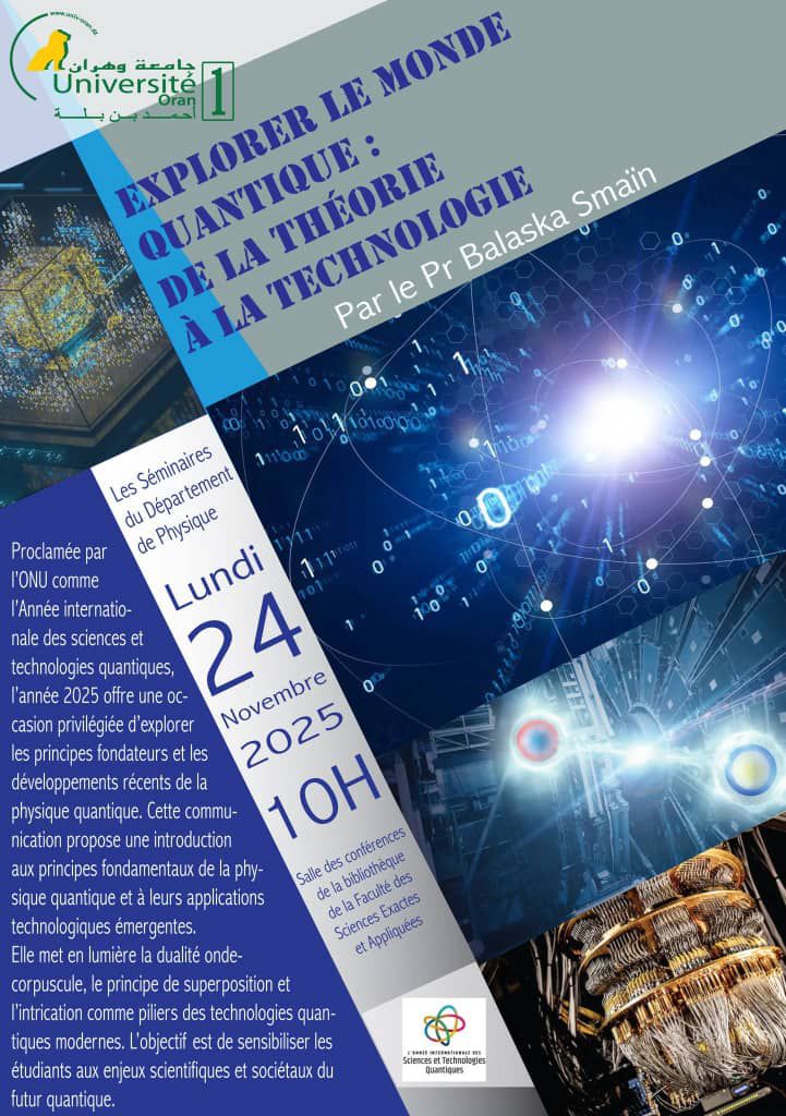 يسرّ قسم الفيزياء -كلية العلوم الدقيقة والتطبيقية- أن يعلن عن تنظيم محاضرة علمية بعنوان: “استكشاف العالم الكمي: من النظرية إلى التكنولوجيا” بمناسبة إعلان الأمم المتحدة سنة 2025 سنةً دولية للعلوم والتكنولوجيات الكمية، تشكّل هذه الفعالية فرصة مميّزة للتعرّف على المبادئ الأساسية والتطورات الحديثة في الفيزياء الكمية.