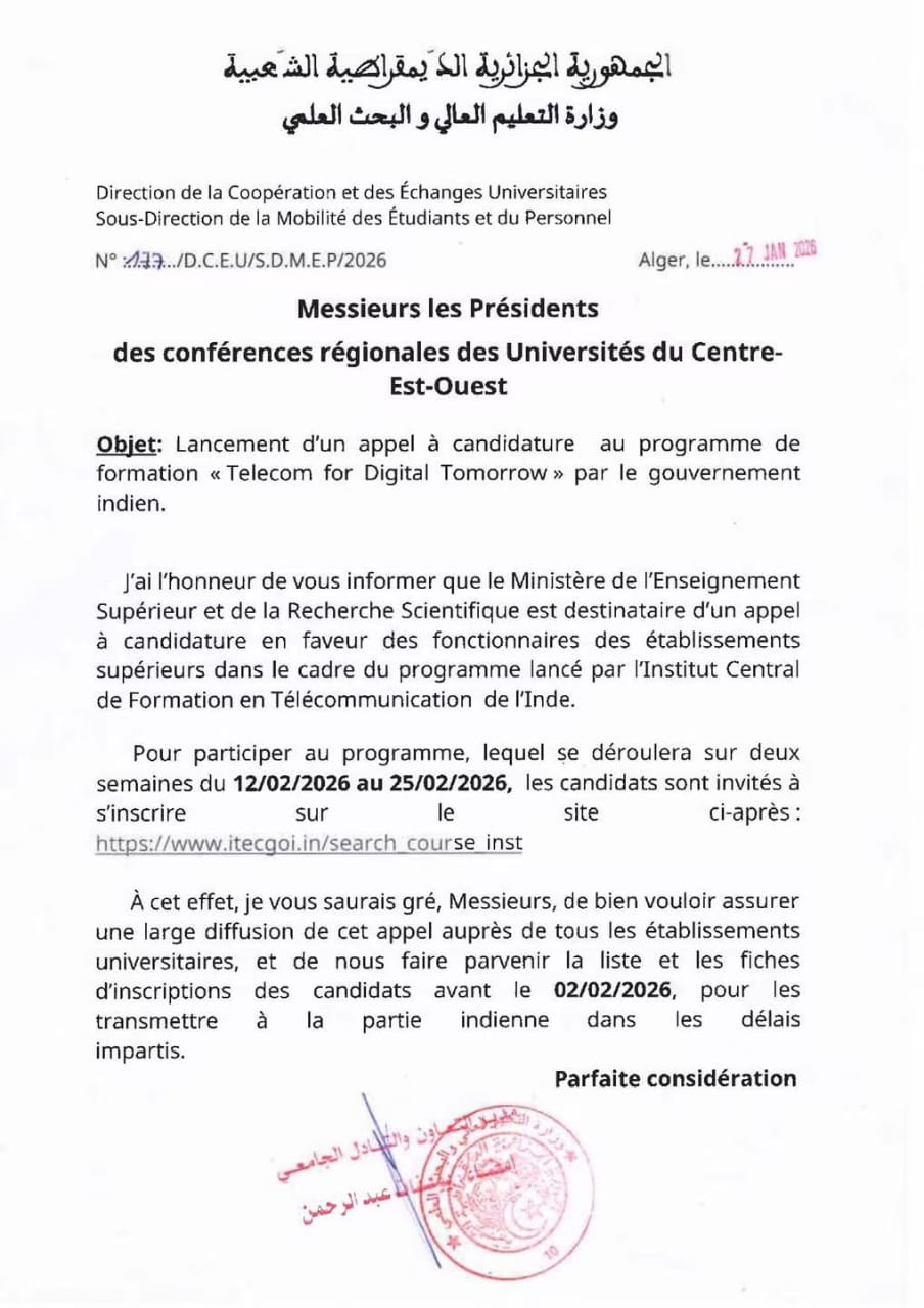 دعوة لتقديم الطلبات للبرنامج التدريبي “الاتصالات من أجل الغد الرقمي”، الذي تنظمه حكومة الهند .