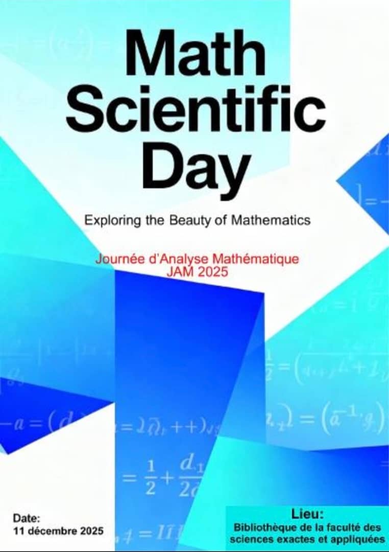 يسرّ قسم الرياضيات – كلية العلوم الدقيقة والتطبيقية بجامعة وهران 1 – الإعلان عن تنظيم اليوم العلمي للرياضيات، وهو فعالية أكاديمية تهدف إلى إبراز ثراء الرياضيات و جمالها وتطبيقاتها المتنوعة، خاصة في مجال التحليل الرياضي.